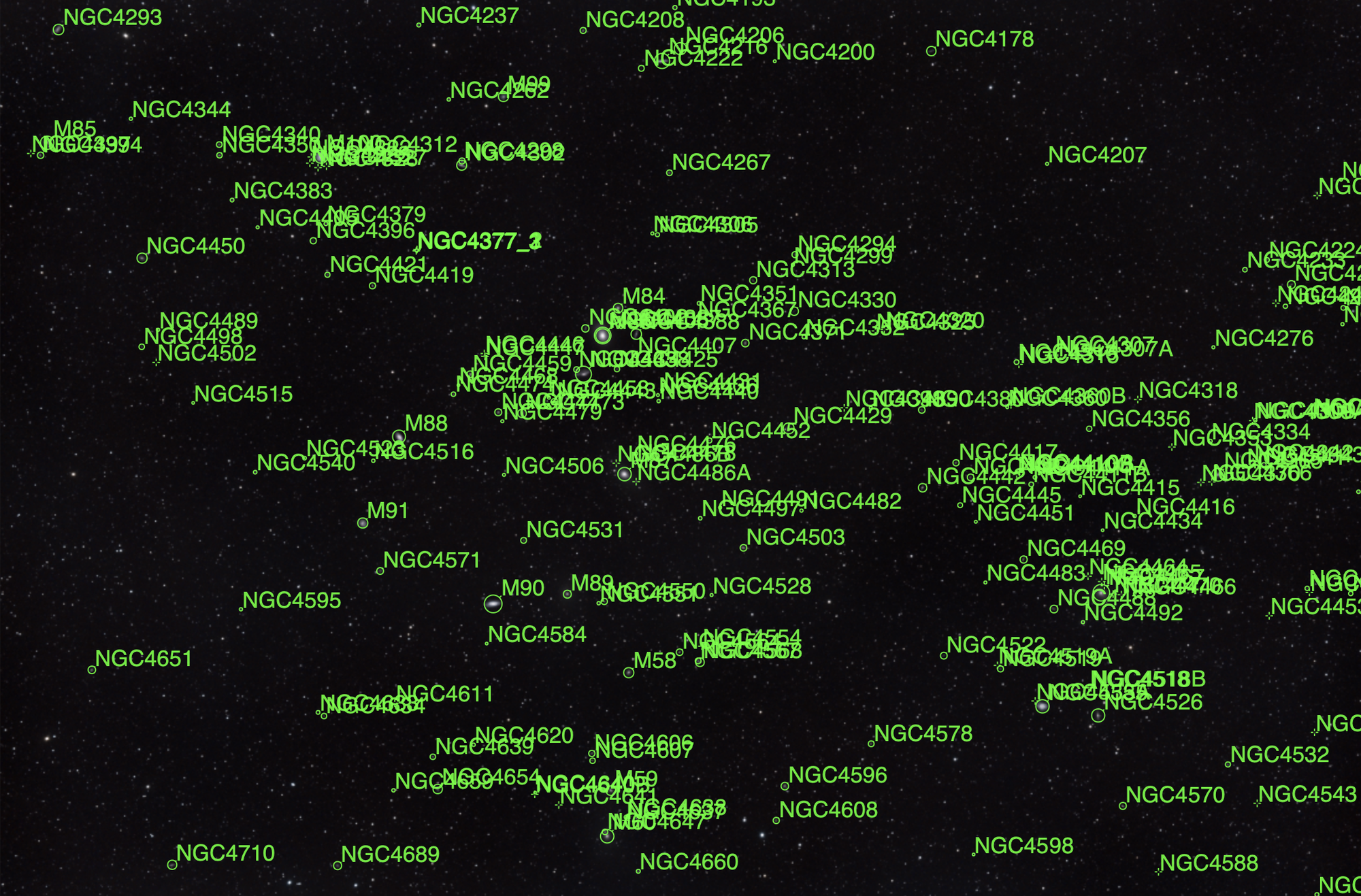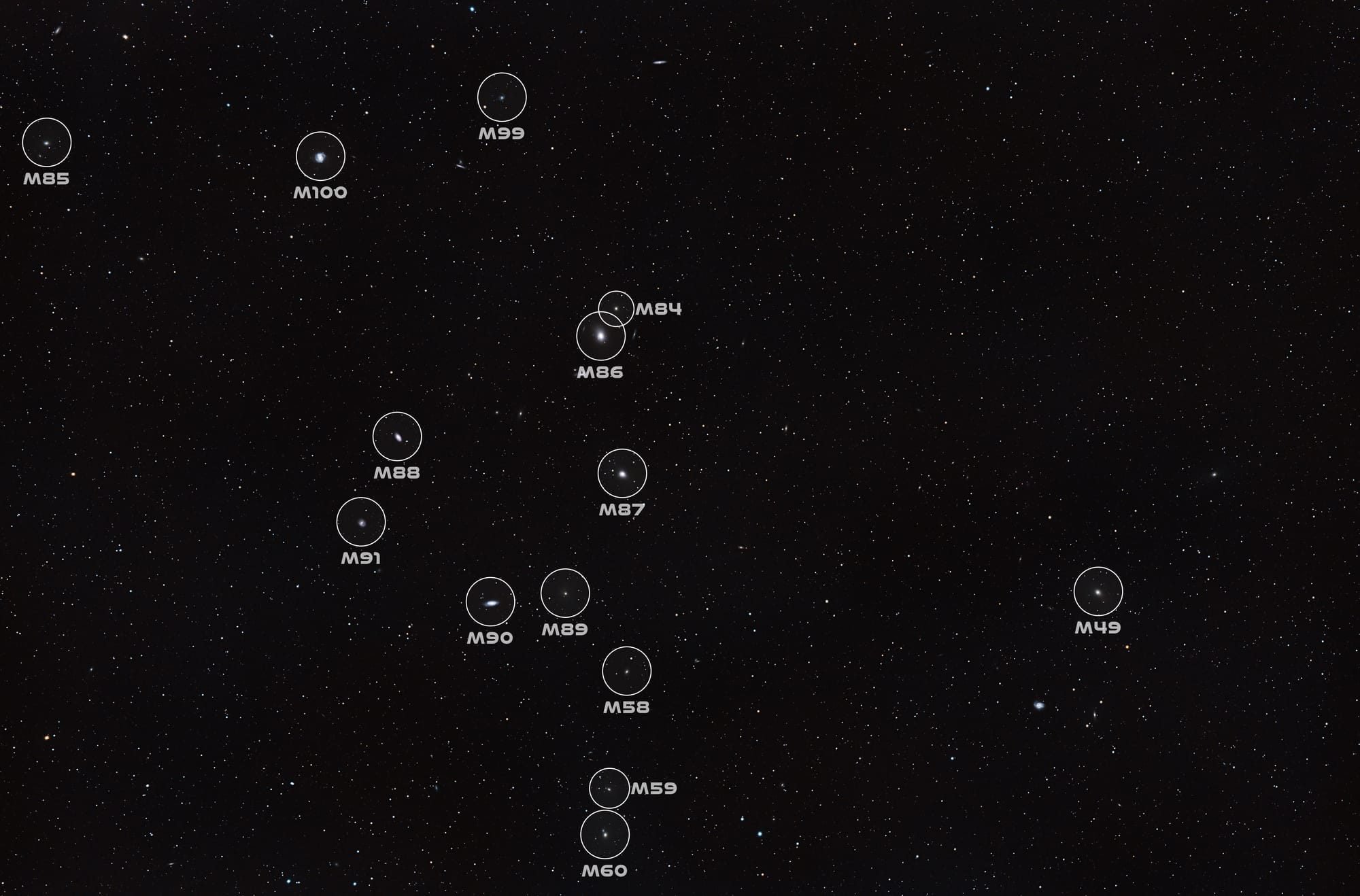 That's right. 14 Messier objects in one shot! The Virgo Cluster is the ultimate bang for your buck. I don't blame you if you can't spot them all in the image above. Here's an annotated version: