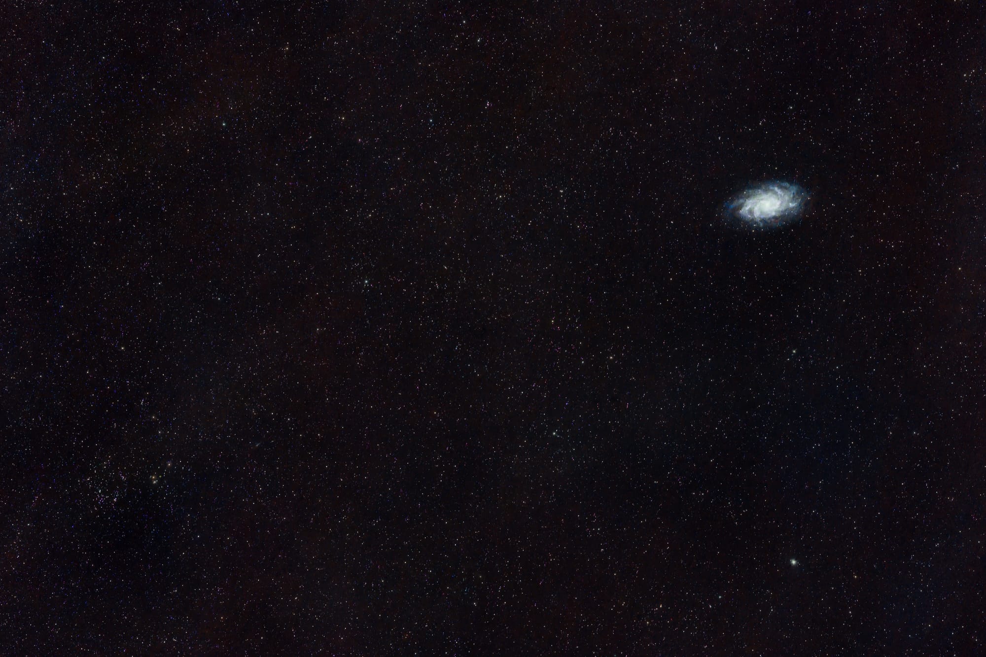 This was just a test shot to see how large the Triangulum Galaxy appeared at 135mm. With a heavy crop, it's alright. Now that I have a tracker, I want to do a real attempt at this, maybe framing the Triangulum constellation and the galaxy in the same shot.